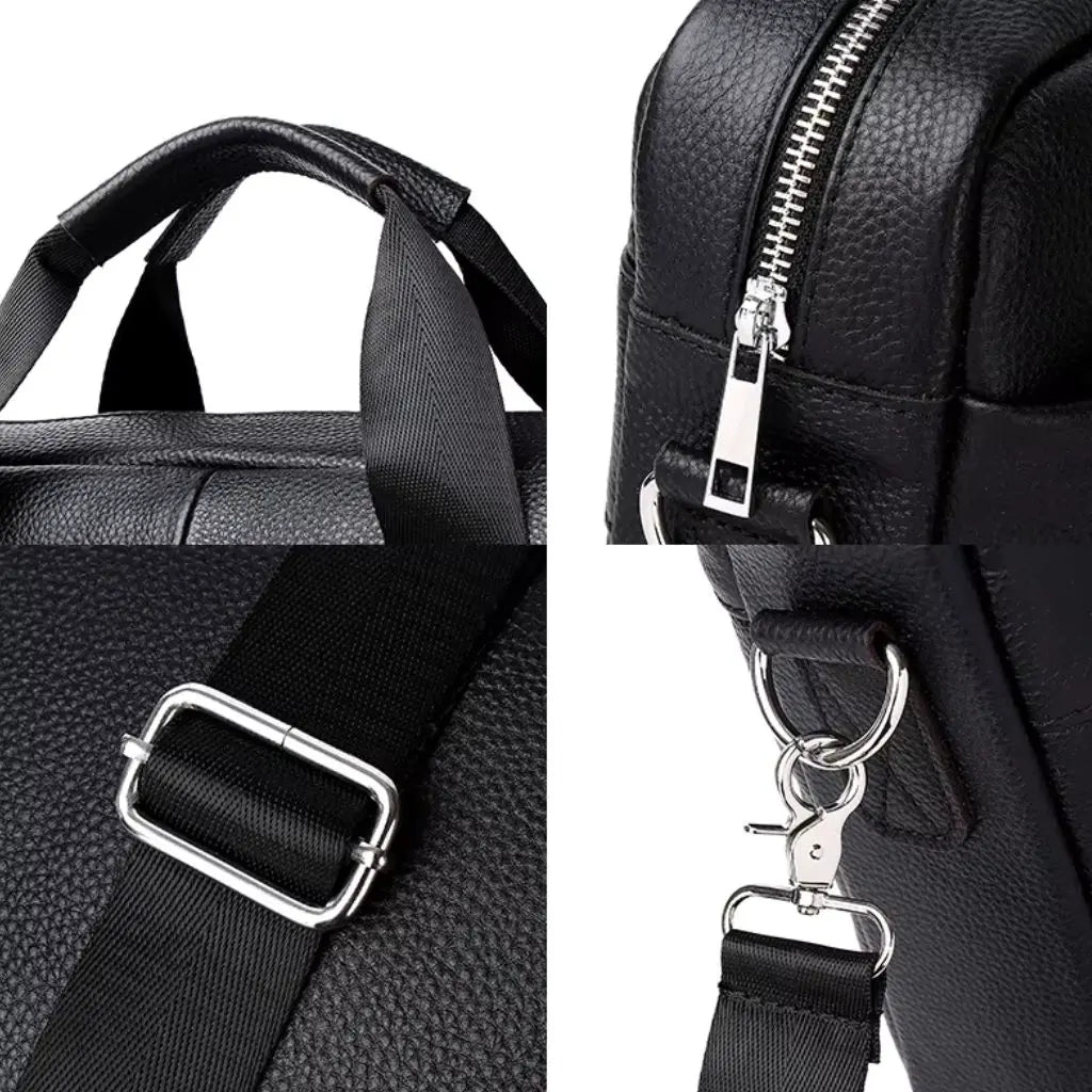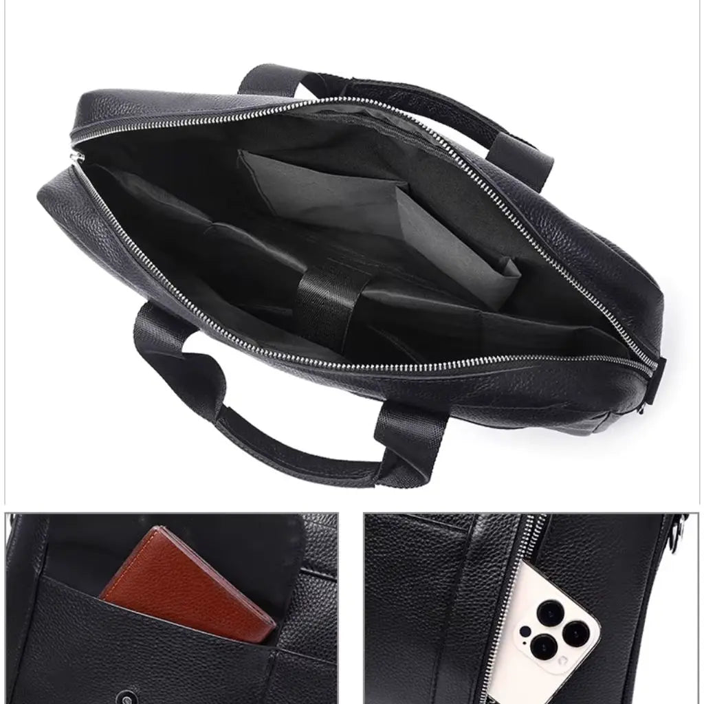 Elevate your professional style with this Black Leather Laptop Bag for Men, meticulously crafted from premium cowhide leather. Designed to offer both elegance and functionality, this briefcase ensures your laptop remains protected and organized.