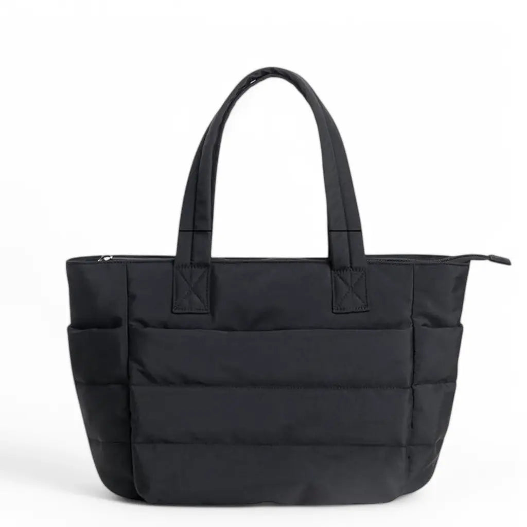 This black puffer tote bag blends on-trend style with everyday practicality. The quilted, padded exterior gives a chic “puffy” look while keeping the bag lightweight and comfortable. Perfect for office, travel or casual outings, it fits your laptop, books, gym gear or essentials. Long shoulder straps ensure easy carry, and the minimalist design makes it versatile for any outfit. Inside, well-organized compartments help keep your items tidy, while the durable material resists wear and tear. Whether you’re heading to work or running errands, this quilted puffer tote elevates your look with style and function.