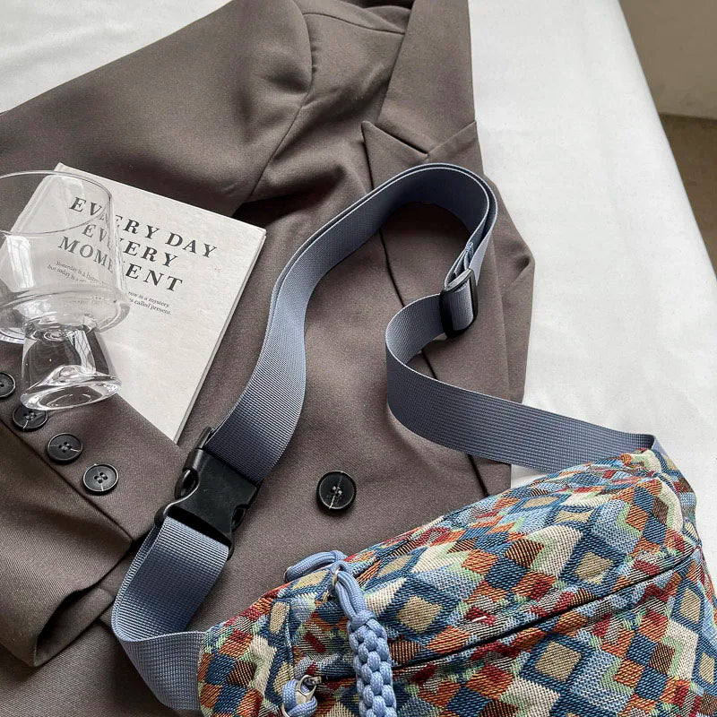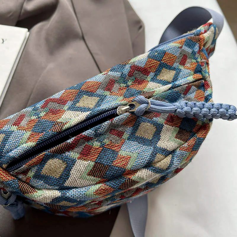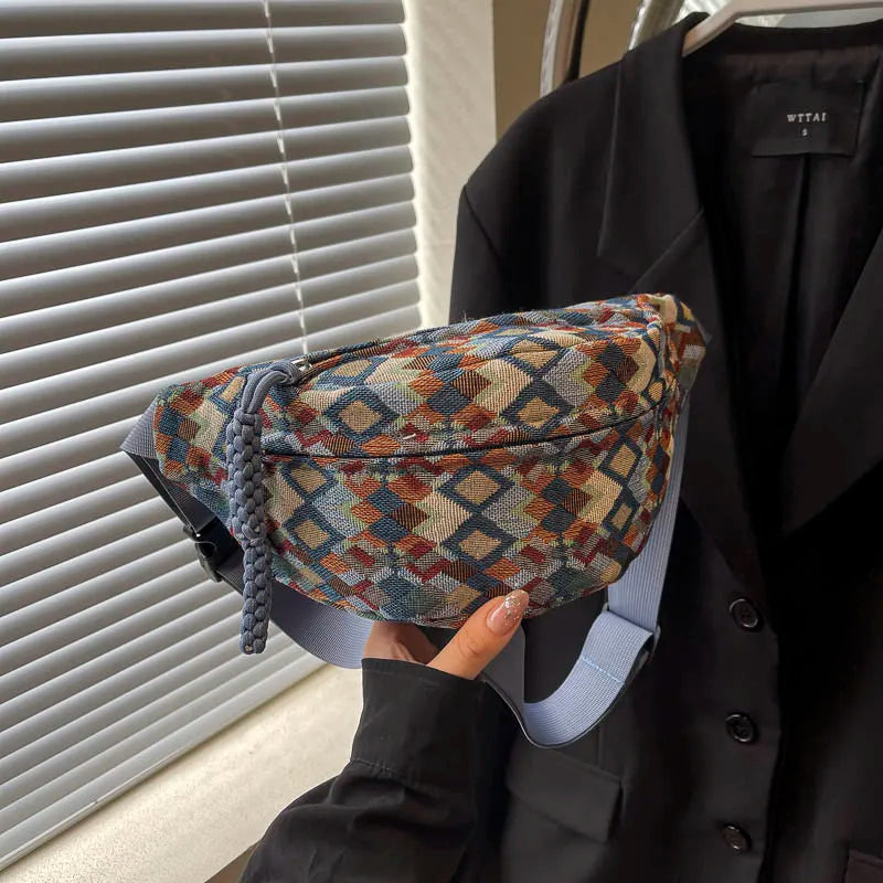 Elevate your everyday style with this geometric crossbody banana bag, a chic fusion of fashion and function. Designed with a unique geometric pattern, this bag serves as both a crossbody and fanny pack, offering versatility for various occasions. The adjustable strap ensures a comfortable fit, while the secure zipper closure keeps your essentials safe. Its compact size provides ample space for your phone, keys, and wallet, making it perfect for daily use, shopping trips, or adding a playful touch to your casual outfits. Whether you're heading out for a walk or meeting friends, this bag adds a pop of style and practicality to your ensemble.