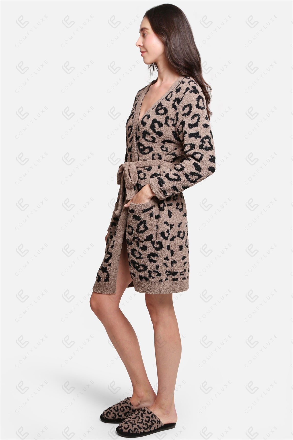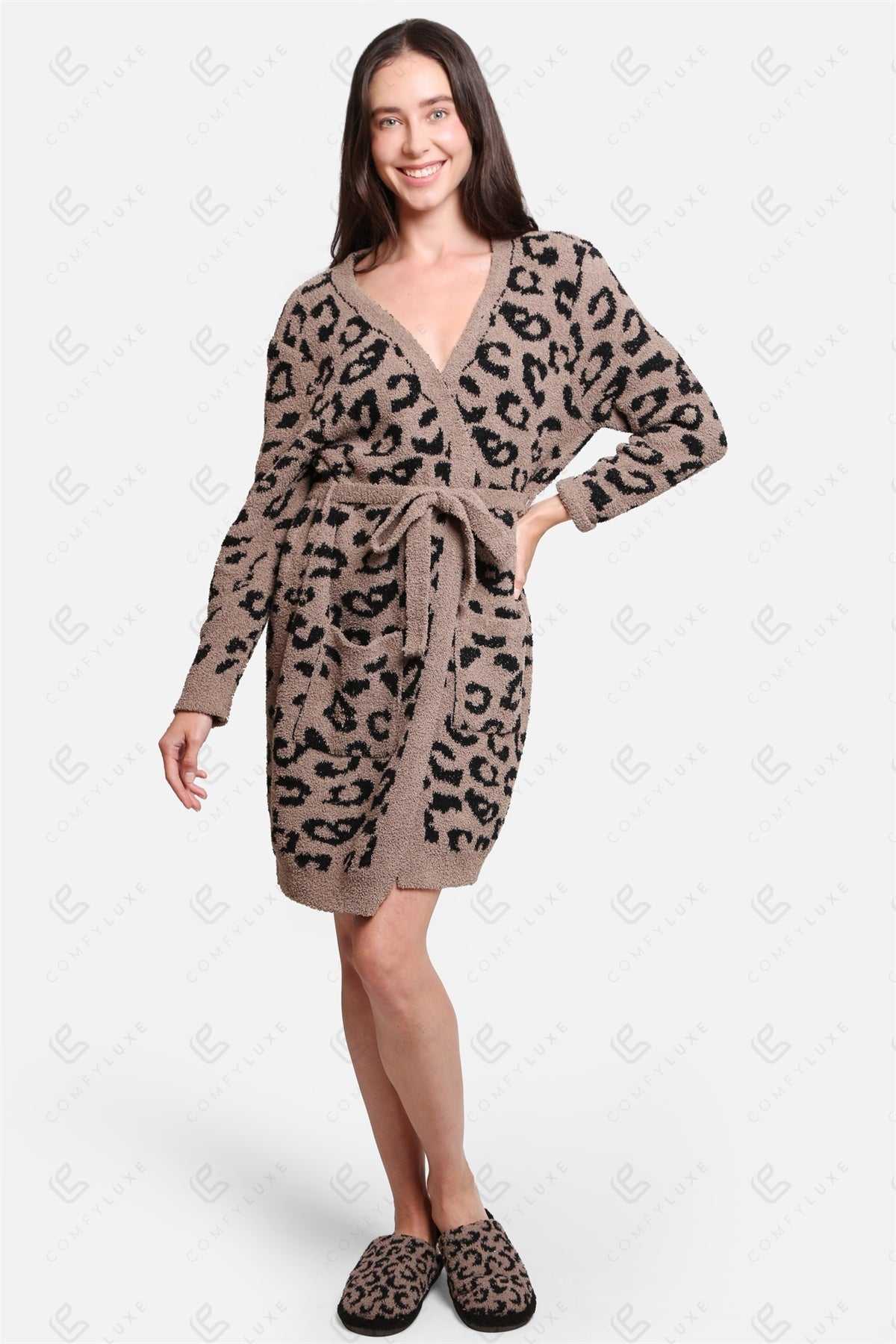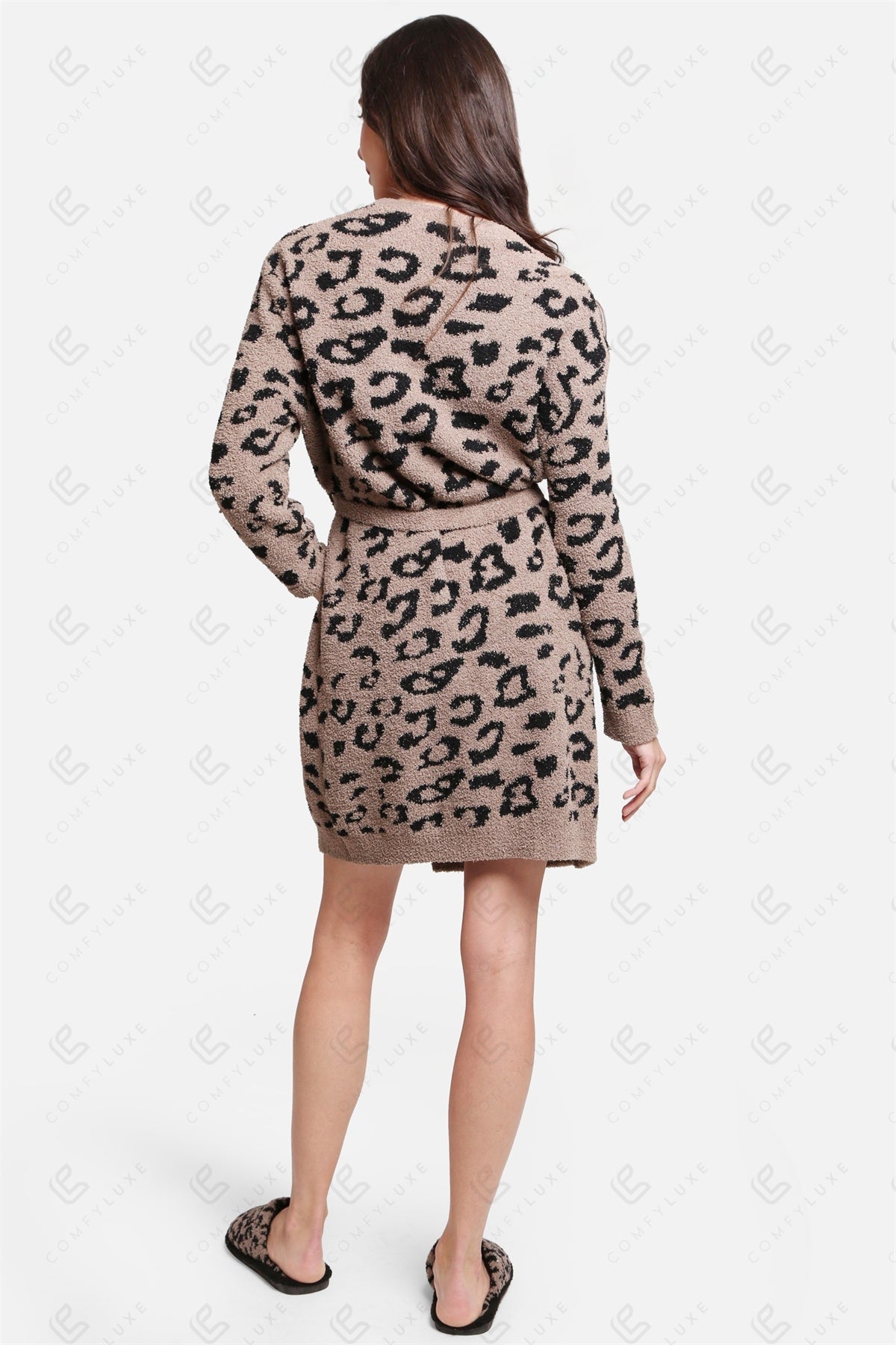 Indulge in the ultimate comfort with our Luxe Leopard Print Microfiber Robe. Crafted from premium 100% polyester microfiber, this robe offers a plush, breathable feel against the skin, making it perfect for lounging at home or unwinding after a long day.