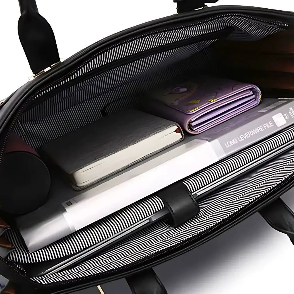 The bag features a thoughtfully organized interior with dedicated compartments for your laptop, documents, and personal items, keeping everything in place and easily accessible. Its elegant design, complemented by subtle color accents, makes it suitable for various occasions, from office settings to casual outings.