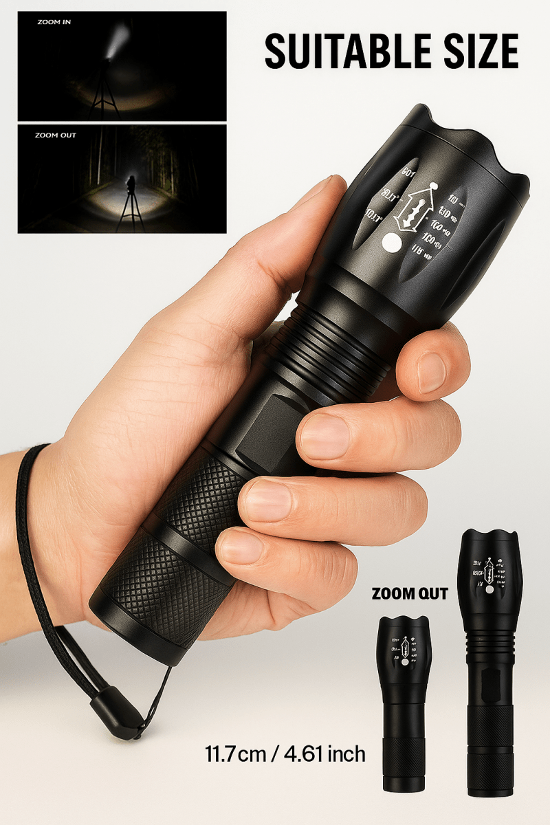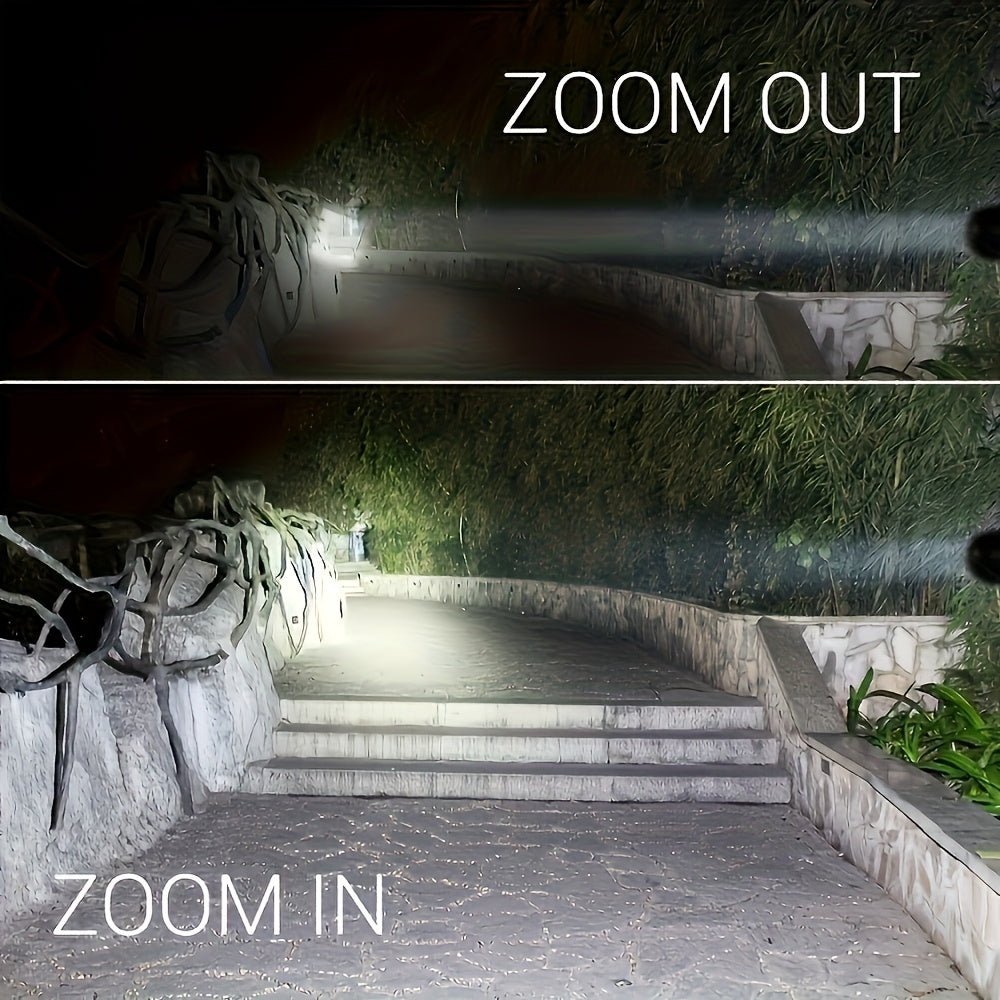 Illuminate your path with this high-performance tactical LED flashlight. Delivering up to 1000 lumens, it offers exceptional brightness for various situations. The adjustable zoom function allows you to switch between a wide floodlight and a focused spotlight effortlessly.