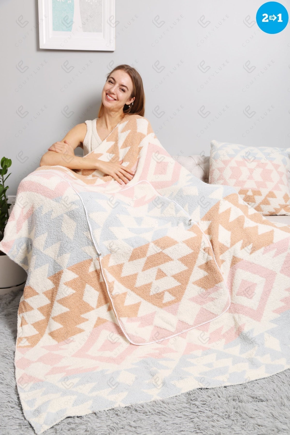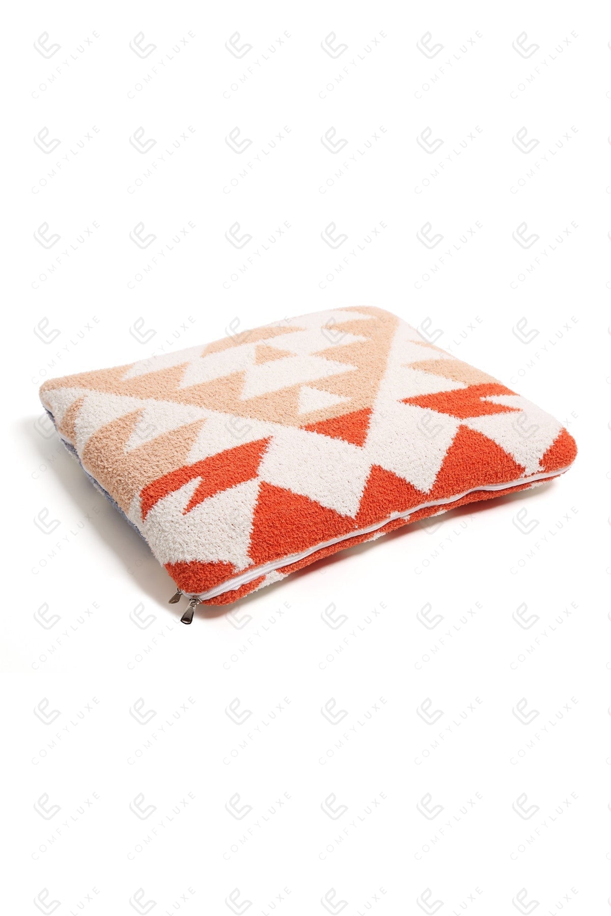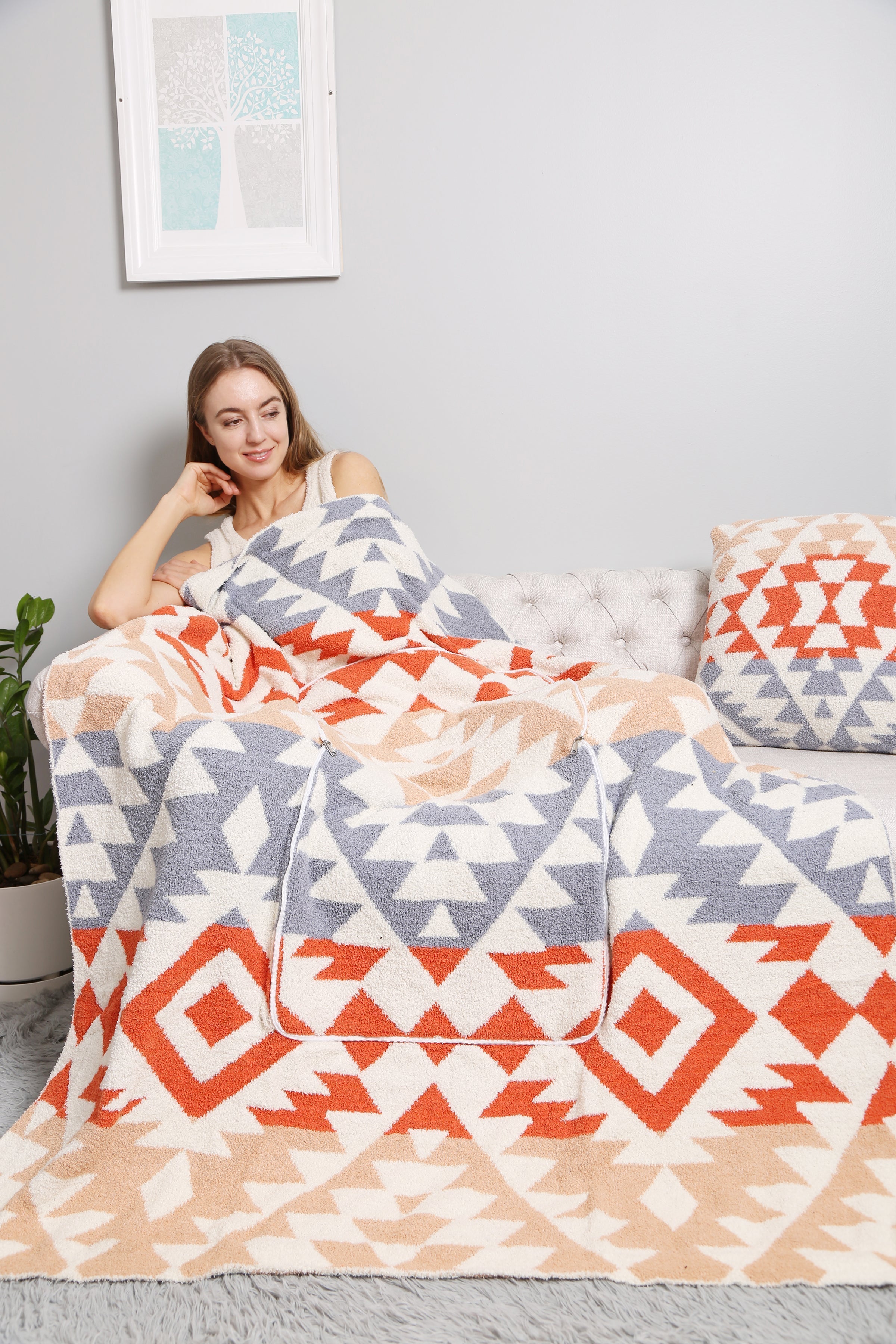 Featuring a vibrant tribal pattern in Orange/Camel or Pink/Blue, it complements modern, bohemian, and minimalist interiors. Lightweight and durable, this blanket is easy to care for—machine washable with cold water, no bleach, lay flat to dry, do not iron, and do not dry clean.