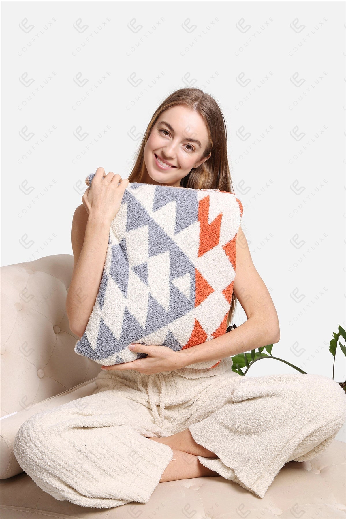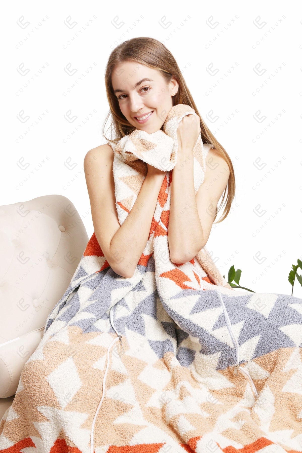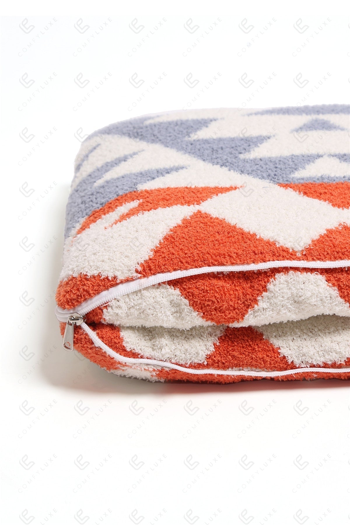 Featuring a vibrant tribal pattern in Orange/Camel or Pink/Blue, it complements modern, bohemian, and minimalist interiors. Lightweight and durable, this blanket is easy to care for—machine washable with cold water, no bleach, lay flat to dry, do not iron, and do not dry clean.