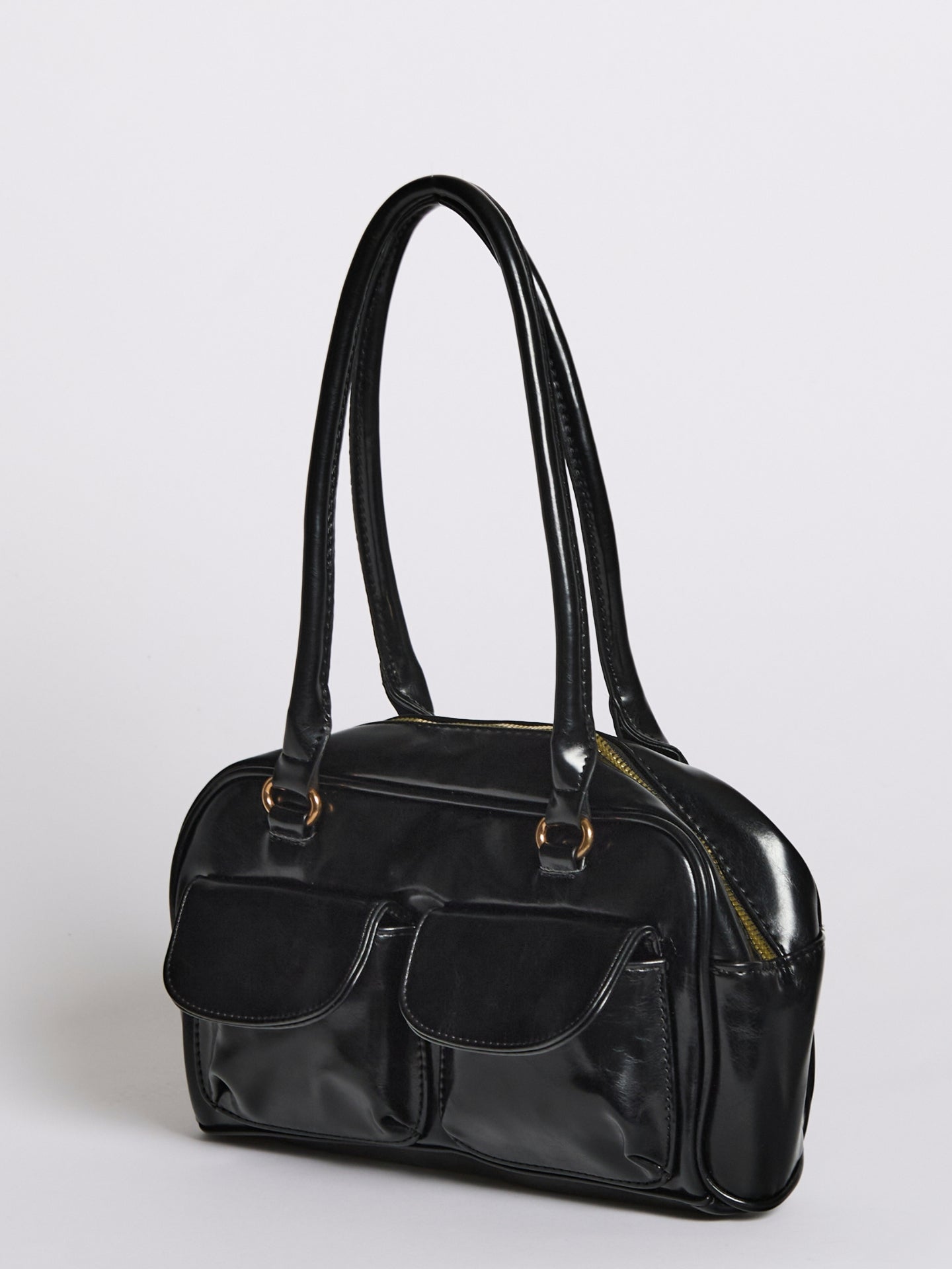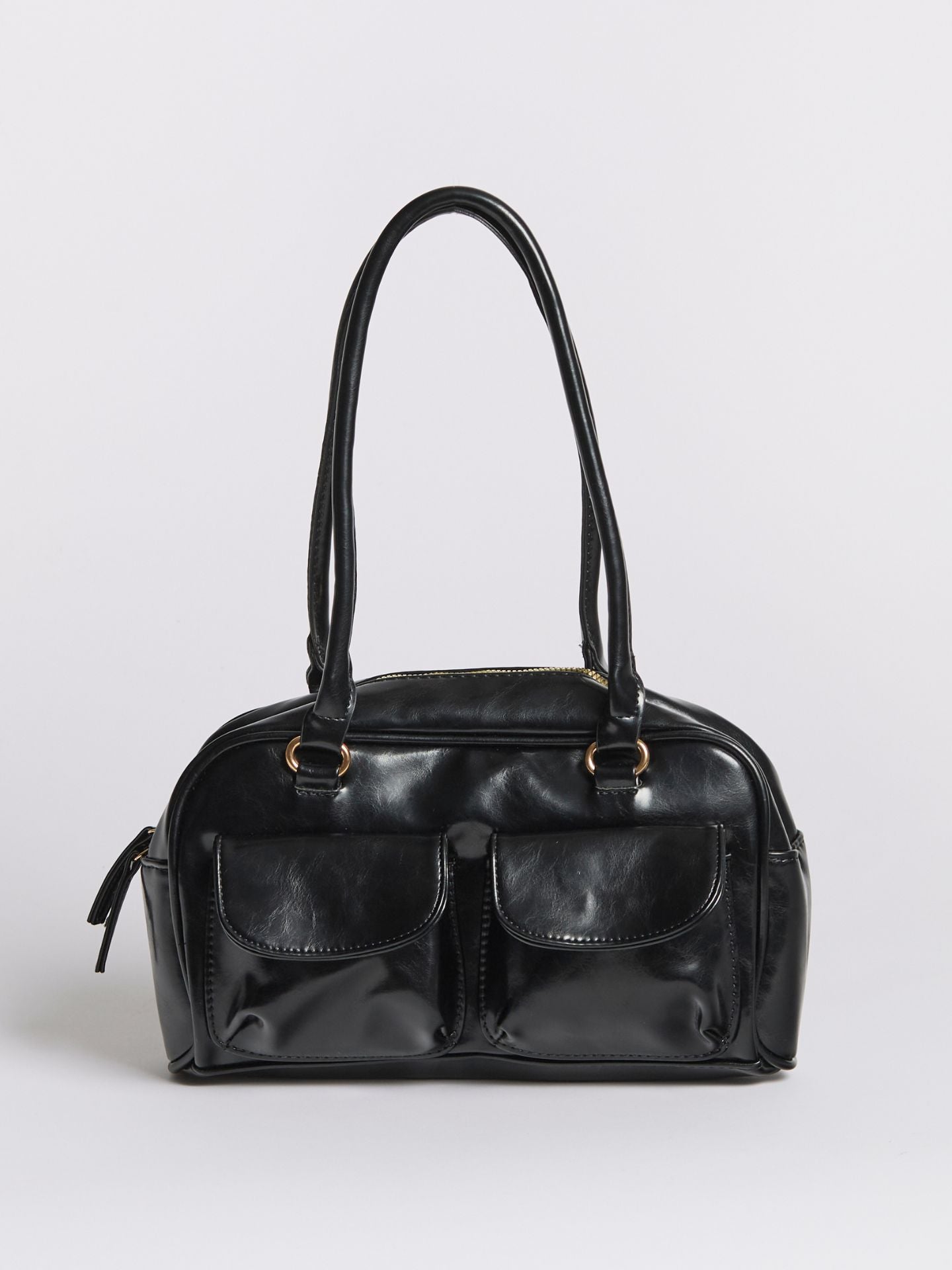 Vegan Leather Black Handbag with Dual Front Pockets – Stylish & Spacious