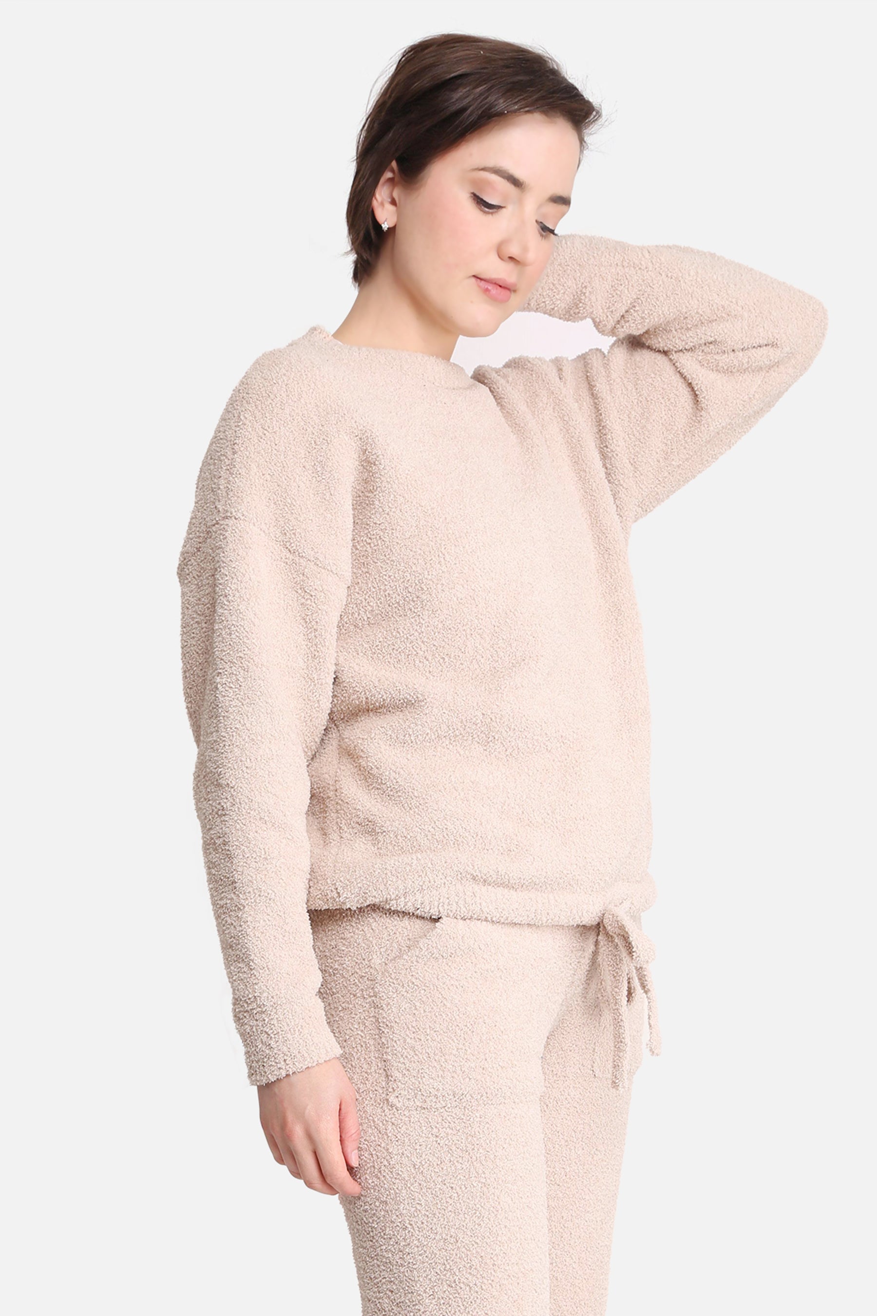Enjoy cozy style and ultimate comfort with this women’s loungewear sweater in beige and black. Crafted from premium microfiber polyester, the fabric feels soft, warm, and gentle on the skin. The adjustable drawstring hem lets you shape the fit — wear it loose or cinched for a more tailored look. Available in S/M and L/XL, this soft pullover top blends fashion and function seamlessly. Perfect for lounging at home or going out casually, it pairs beautifully with jeans, leggings, or joggers. Machine-wash cold, do not bleach, lay flat to dry. Elevate your cozy wardrobe with this versatile, stylish sweater that’s made for relaxed days and effortless chic.